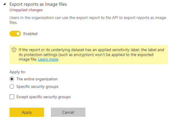 A setting “Export reports as image files” is available via the Power BI Admin Portal, Tenant Settings. You can enable this feature either for the whole organization or maybe a specific security group. You have to be a global admin or Power BI service admin to access the Power BI admin portal.