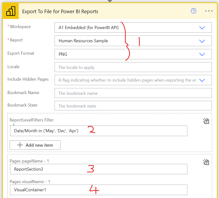 Page and Visual name go together, albeit Visual is optional. You must specify a Page in order to export and you can in fact export multiple pages / visuals in one action by creating an array. Note that if you specify multiple pages/visuals, the output of the action will be a zip file of specific files (e.g. png), rather than an array of png’s. You would therefore need to save and extract the images from the zip file output.