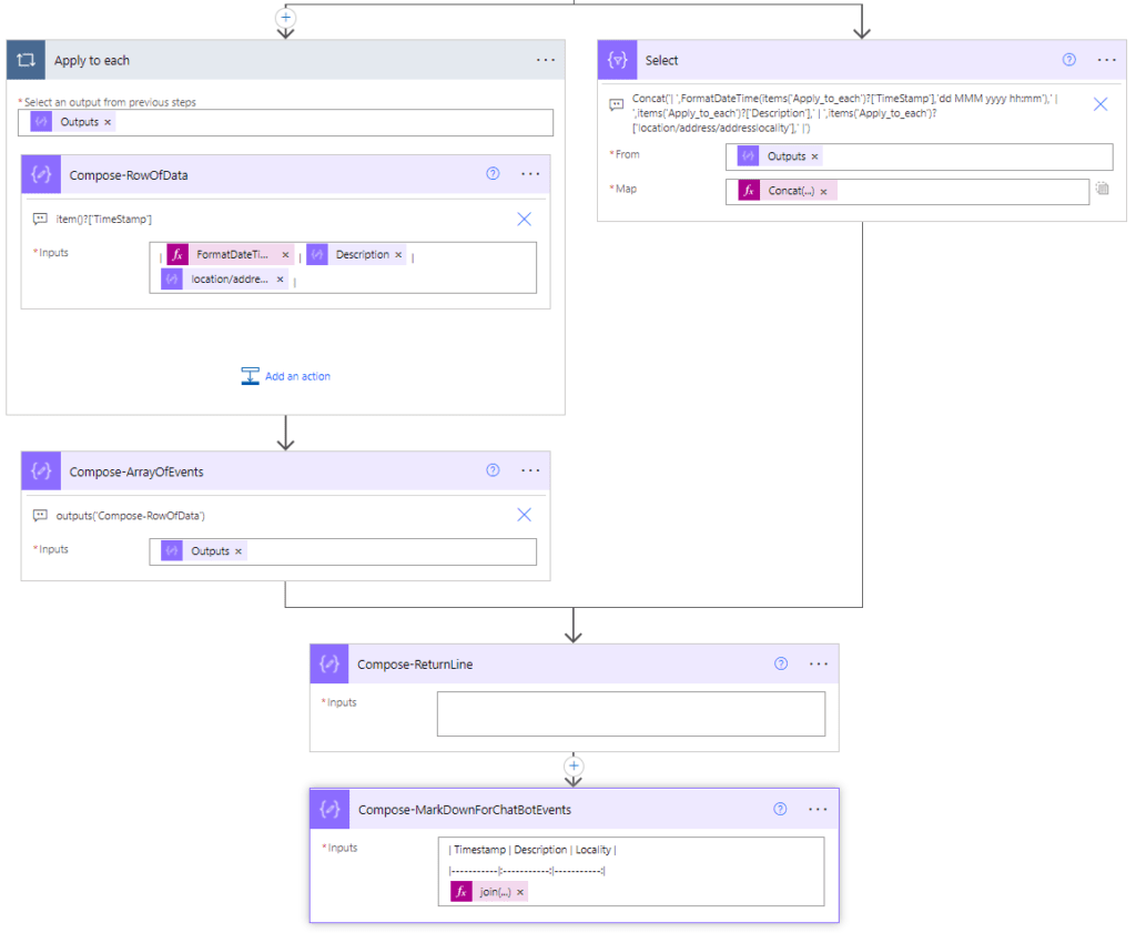 The apply to each is the more conventional method where we take the array as input, create a string in a compose, and then bring those strings back together to form an array using outputs (Pieters Method). Using select and concat, I can build exactly the same output but in a single api call. This has huge efficiency benefit when processing large arrays.