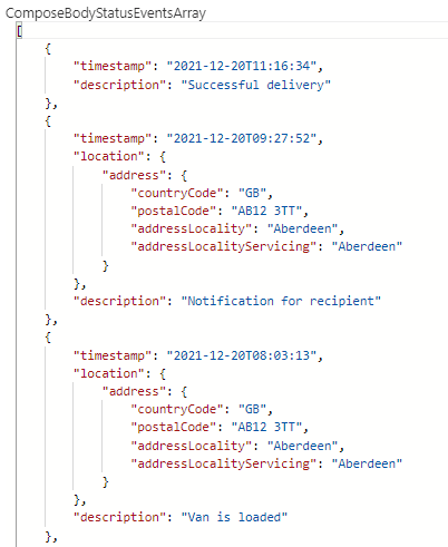 Next I really just wanted to demonstrate how you can achieve the same output more efficiently using a select action. Below I am taking the array of parcel event data and repurposing it as an array of object strings.