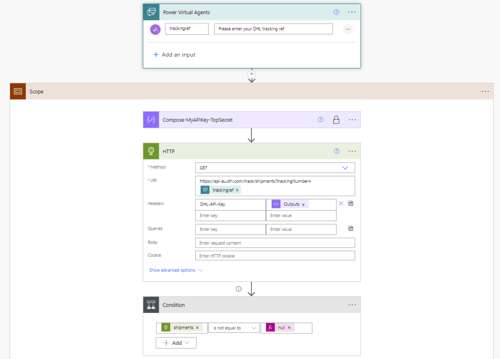 My flow begins with the PVA trigger and trackingref input, which allows me to accept the input from the end user conversation. I then have a compose with my API key from DHL, a call to the HTTP action with the tracking reference as part of the URL and a header for the API Key. Then I have a condition which is setup to run on success and failure (as the HTTP call will fail if no parcel is found) and it checks to see if the shipment array is null.