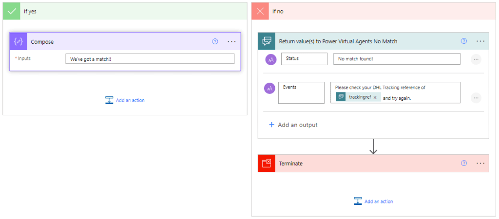 If the condition is evaluated true, I simply have a compose with a string in it. This allows me to play out the rest of the flow using the full width of the editor. I do not need to put the rest of my flow in the yes container. In the no, I return the default values back to PVA of “no match found!” and a request to check that the reference was valid. The flow then terminates as succesful and no further actions will be run.