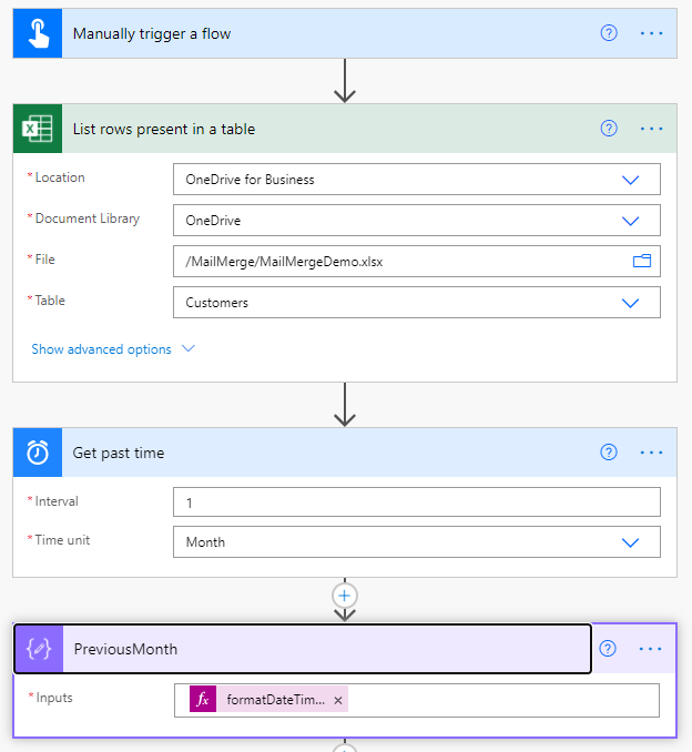 For the purpose of my demo the trigger is manual but you could schedule this for any day of the week or month. I get all of the customer details from the table in excel and then perform a calculation on today’s date using the formatdatetime expression to get the previous month as a full name. The expression used is: