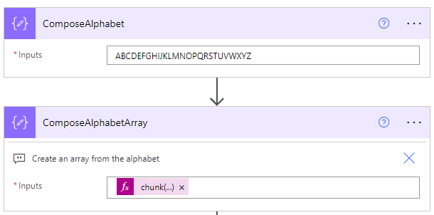 ComposeAlphabetArray: using expression chunk(outputs(‘ComposeAlphabet’), 1) an array is created of all the letters.