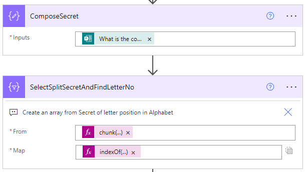 SelectSplitSecretAndFindLetterNo: Two expressions in this one, the first is chunk(outputs(‘ComposeSecret’), 1) and this is so that our secret string is now an array of letters. The second expression in the Map (text mode) indexOf(outputs(‘ComposeAlphabet’), item()) is used to calculate the index of the secret word letters based on the opening alphabet string. A=0, B=1 … Z=25. As objects in an array can be selected by integer indexes, this works nicely for our efficient script (demos of this on my YouTube videos)