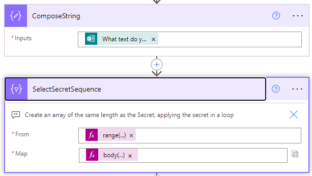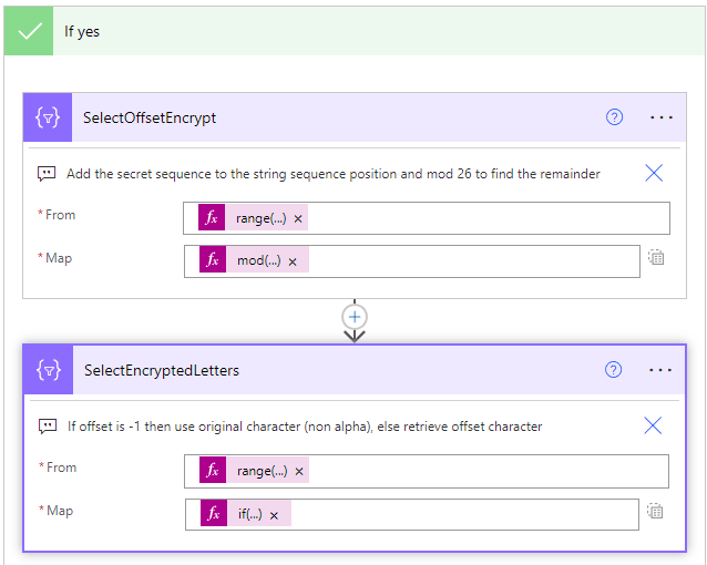 SelectOffsetEncrypt: two expressions the from is based on range(0, length(outputs(‘ComposeString’))) which we have seen multiple times now, the map is mod(add(body(‘SelectSecretSequence’)?[item()], body(‘SelectStringSequence’)?[item()]), 26) where we are adding the secret sequence index and the string sequence index, using mod 26 to return the remainder and this becomes are new letter index. This creates an array of new letter indexes.