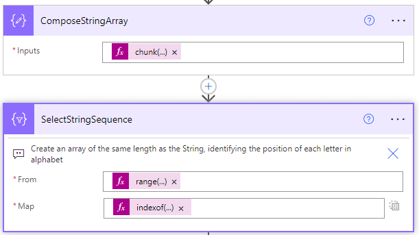 SelectStringSequence: two expressions here, the first range(0, length(outputs(‘ComposeString’))) is based on an array of numbers, starting from 0 and of size based on the length of the string. The second in the map is indexof(outputs(‘ComposeAlphabet’), outputs(‘ComposeStringArray’)?[item()]) where we are returning the index of each letter in the string based on our alphabet string. This gives us an array of indexes.