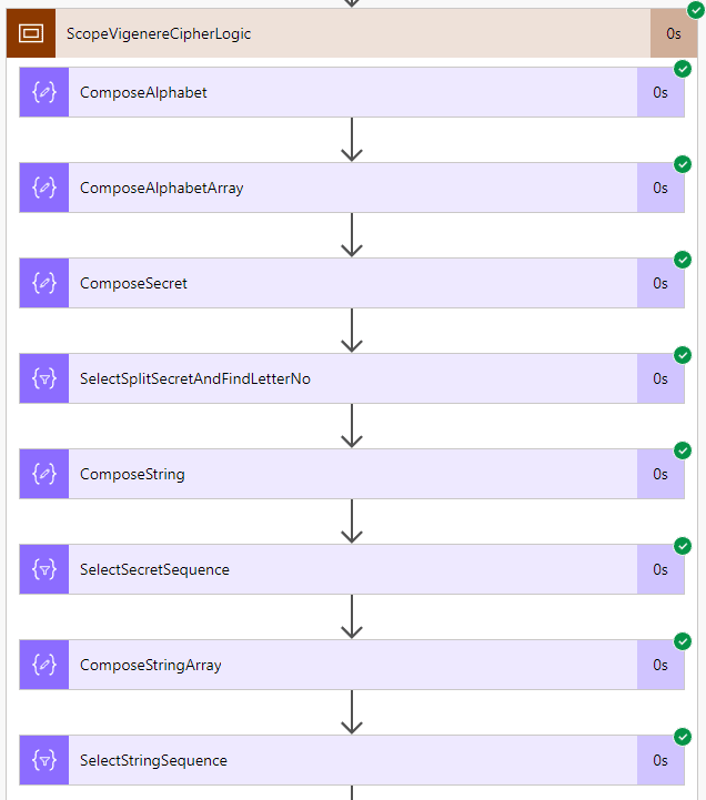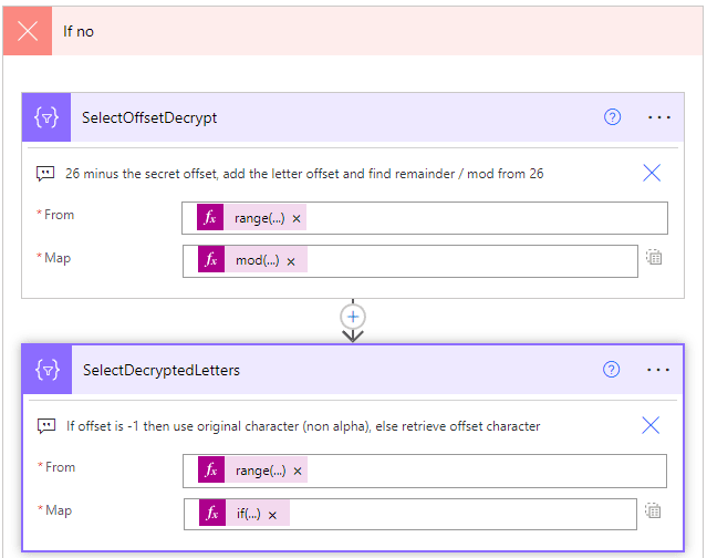 SelectDecryptedLetters: is based on two expressions, from is, you guessed it, the same range expression to calculate those indexes and then map is similar to the encrypt, albeit using the indexes from the SelectOffsetDecrypt array if(equals(body(‘SelectStringSequence’)?[item()], -1), outputs(‘ComposeStringArray’)?[item()], outputs(‘ComposeAlphabetArray’)?[body(‘SelectOffsetDecrypt’)?[item()]]). The result of this action is an array of decrypted letters based on the calculated offsets.