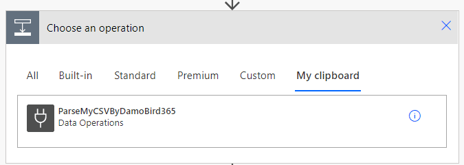 Upon Selecting the pasted action “ParseMyCSVByDamoBird365” into Power Automate you will see the pre-populated Action below: