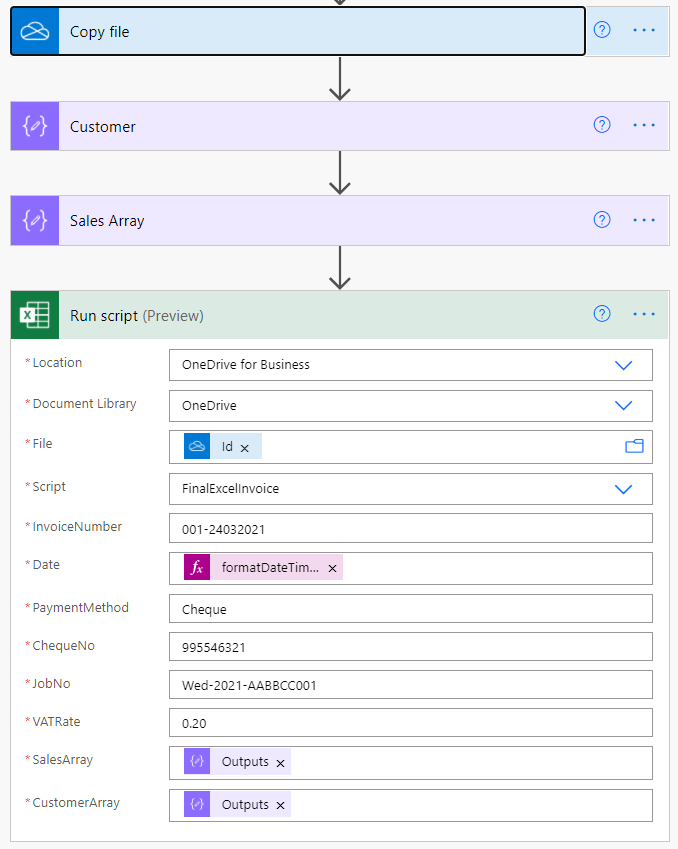 I have the blue invoice template stored on my OneDrive and will take a copy of this file each time my Power Automate runs, saving a new copy with dynamic name, allowing multiple invoices to be saved. I have prepared two arrays, one for the customer data and another containing the multiple line order details. I also supply my Action with several other data fields, including invoice number, date, vat rate amongst others, all of which can be supplied dynamically if you require. I have prepared my two arrays as follows: