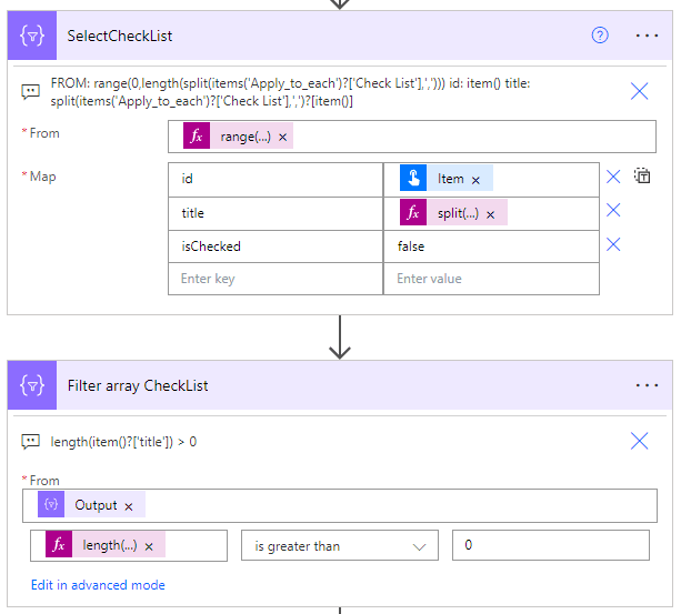Next we must create an array for our check list and each item in the list must have a unique ID, a title (based on our excel table column) and an ischecked value, for which we have set to false, i.e. not checked. For that we use a select and a filter (to remove any objects with a blank title).