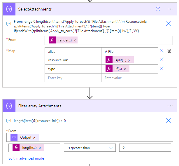 From: range(0,length(split(items('Apply_to_each')?['File Attachment'],','))) ResourceLink: split(items('Apply_to_each')?['File Attachment'],',')?[item()] type: If(endsWith(split(items('Apply_to_each')?['File Attachment'],',')?[item()],'lsx'),'E','W')