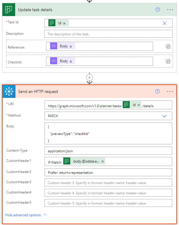 CustomHeader1: If-Match: @{outputs('Update_task_details')?['body']?['@odata.etag']}