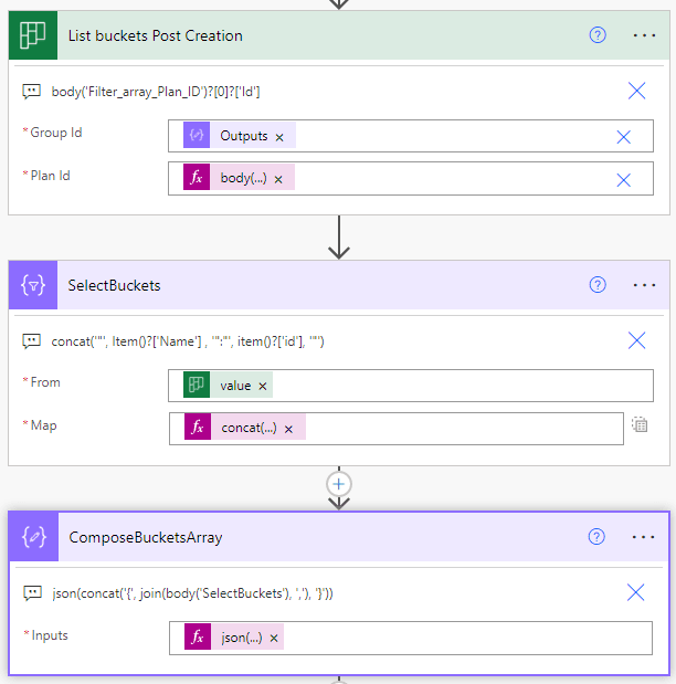 Next we must create bukets that are missing from the action above. For example, we have a plan with 3 buckets but our excel table has 4 buckets, maybe we have introduced a new quarter (Q4) or project stage to our table but not yet configured it on our plan. The next few actions will identify the missing buckets and create them for us.