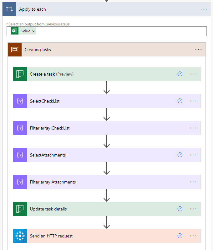 The complete apply to each excel row to create and update a task looks like follows: