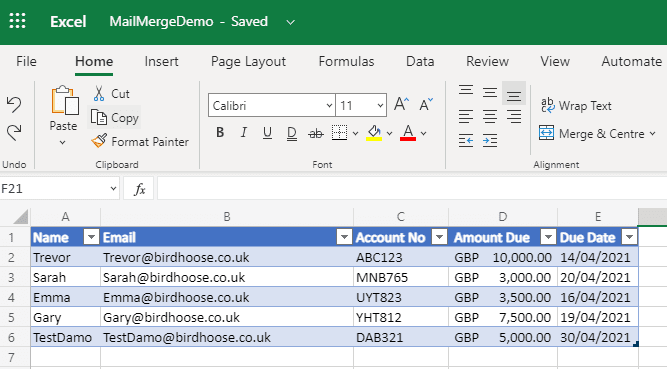 Using a traditional Excel file as the customer data source, I have a list of names, emails, account numbers, amount due and a due date. I will use some of these fields to create the mail merge email content but also the Account Number to retrieve the file relevant to the customer when sending an attachment.