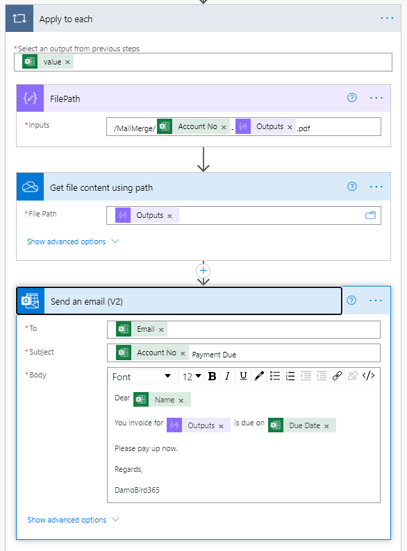 "emailMessage/Body": "<p>Dear @{items('Apply_to_each')?['Name']}<br>\n<br>\nYou invoice for @{outputs('PreviousMonth')} is due on @{items('Apply_to_each')?['Due Date']}<br>\n<br>\nPlease pay up now.<br>\n<br>\nRegards,<br>\n<br>\nDamoBird365</p>",