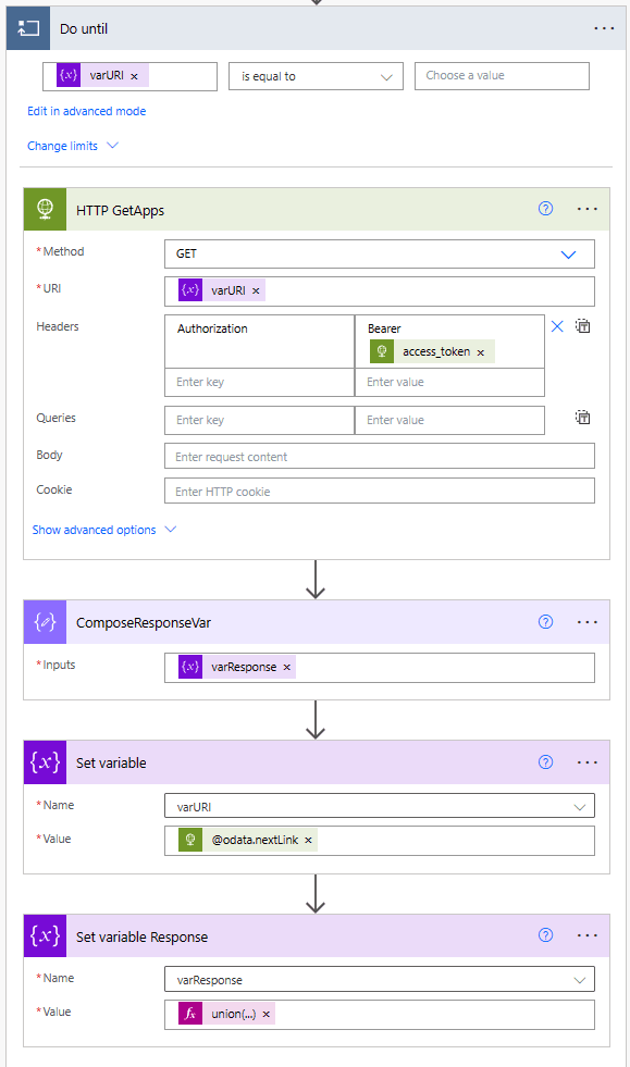 The ComposeResponseVar is a trick, to prevent a variable self referencing itself. We want to create a union of each page of results. A variable cannot self reference, therefore we use a compose to create a copy of the existing variable content and in the set variable reponse, we combine the output of the compose with that of the http call and create an almalgated array union(outputs(‘ComposeResponseVar’),body(‘HTTP_GetApps’)?[‘value’]).