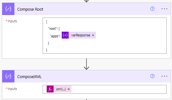 Here we create a json object with root and key name for the variable array of applications. With this, we convert the JSON to XML xml(outputs(‘Compose_Root’))