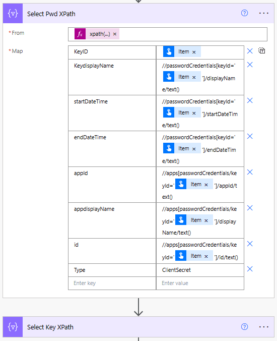 What you see after this is the xml query for each of the properties we want to obtain from the XML. The Select Key XPath is identical, with the exception of the query changing all instances of passwordCredentials with keyCredentials and setting type from ClientSecret or Certificate. This creates us two arrays of the keyid’s and the xml to obtain the additional data about the key, the dates, displaynames etc.