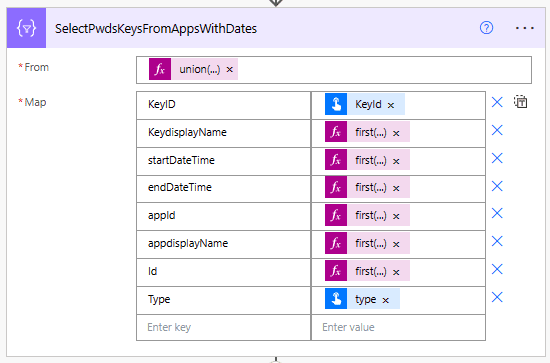 The input is a union of both arrays from above so that we can obtain all of the data in one array union(body(‘Select_Pwd_XPath’),body(‘Select_Key_XPath’)). The KeyID is item()?[‘keyid’], Type is item()?[’type’],followed by expressions to query the xml using the epxressions created in the above arrays