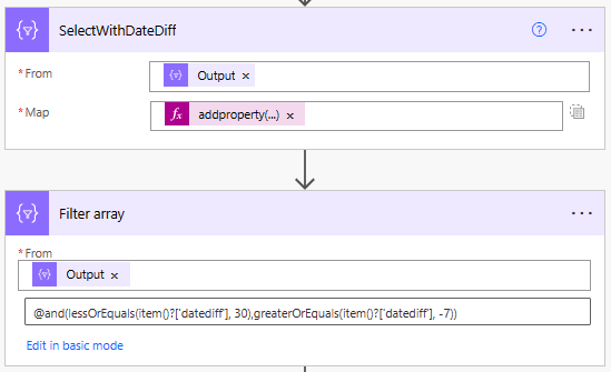 The 2nd action is filtering on the output of our select with the date difference, where the datediff value is less than or equal to 30 days and greater than or equal to -7. I.e. close to or recently expired. @and(lessOrEquals(item()?[‘datediff’], 30),greaterOrEquals(item()?[‘datediff’], -7))