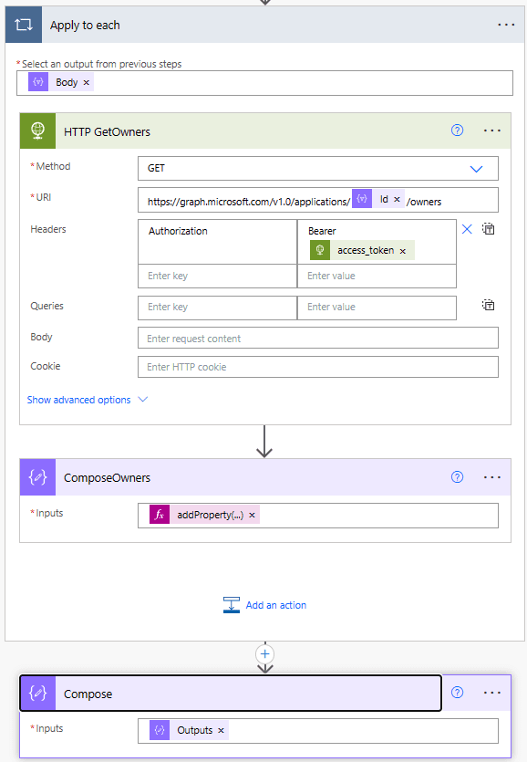 10. Call Graph API for Owners: Utilize the Graph API’s application owners endpoint to retrieve owners for each app registration. Use an “apply to each” loop for individual API calls per application.