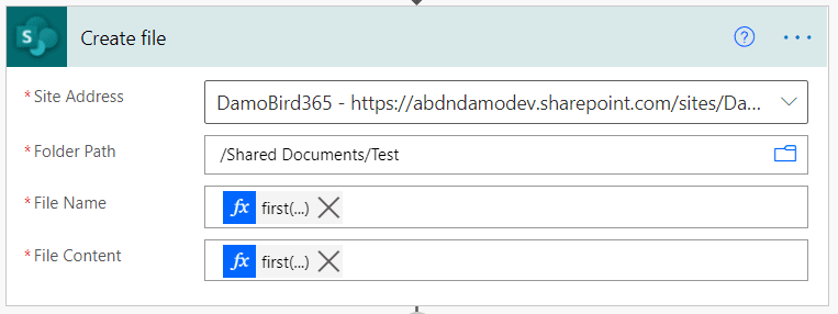 Next, we must save the attachment to SharePoint or OneDrive. In this instance, I have chosen SharePoint. I have also assumed that the email will only contain one attachment. This is to prevent an unnecessary Apply to Each loop. I have therefore used the first() expression in order to retrieve the first object from the name attachments array. These expressions are as per below.