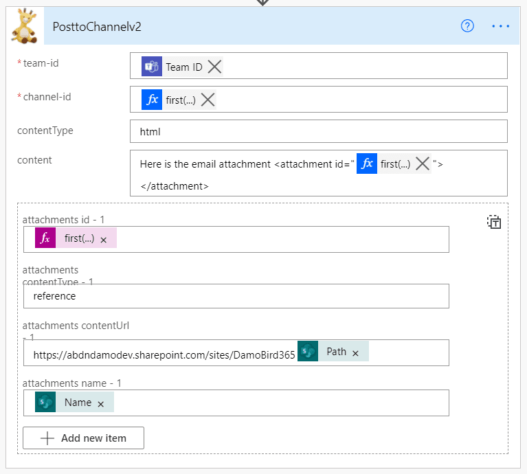 Then using the custom connector, the complete build of which is demonstrated here, the attachment is posted to the Channel.To this custom connector, we must pass the Team ID retrieved from the Get a Team action. Then the first and therefore assumed only channel ID from the filter array. And finally, the attachment ID, retrieved from the attachments array. This the Etag value "{901B48BA-3D2E-41C5-88C2-BF588C9A3322},1" with the curly brackets, comma, and value removed. Hence the expression. Again I have used the first() expression in order to achieve this. Expressions for these two parameters are included below.