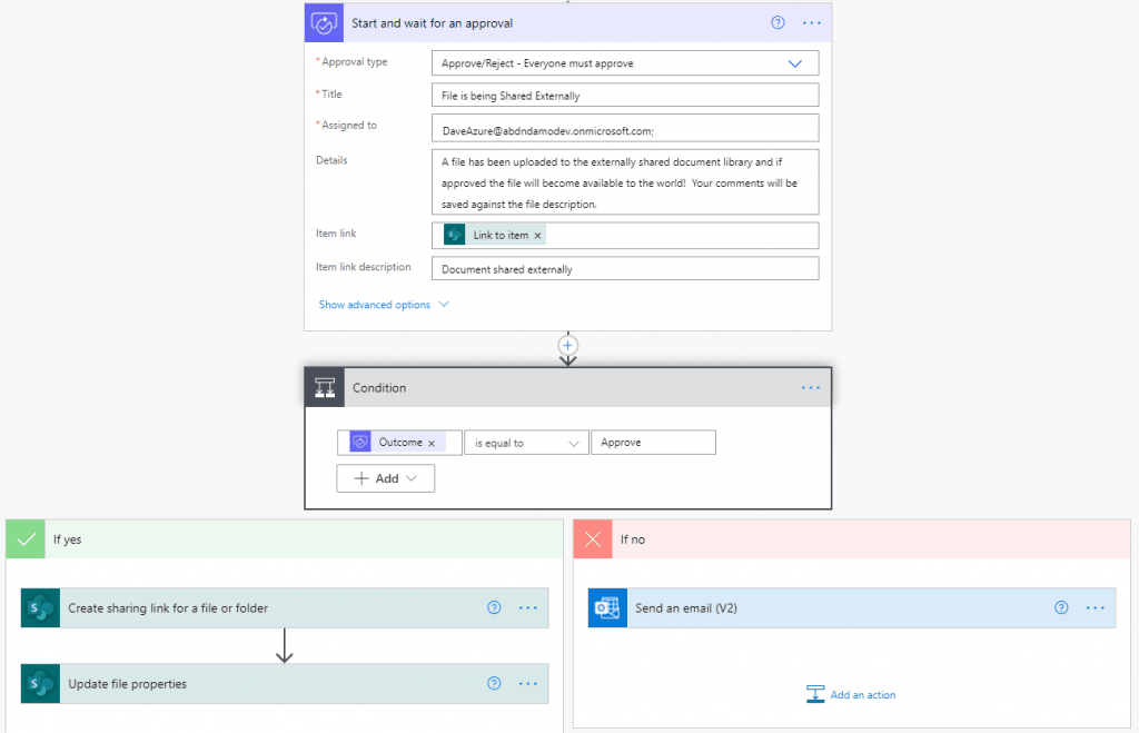The first Cloud Flow is triggered when a file is created in the ExternalFiles folder of the ExternalFiles SharePoint site. I chose a particular folder to reduce the risk of files being saved there by accident. Human error is always a possibility, especially when automation comes in to play. In order to reduce that risk further, I have an approval step in the Flow. A manager is asked to approve the file going live online and upon doing so, a SharingLink is generated as well as the comments saved to the File Description Metadata. If they reject the file upload, the original file owner is notified via Email and can upload the file again if they chose to do so.