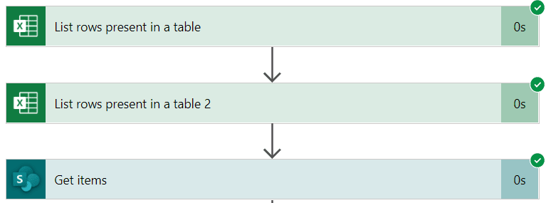 So first thing is to retrieve the data from the various sources, using the above examples, this involves two List Rows Present in a Table for Excel and a single Get Items for SharePoint.