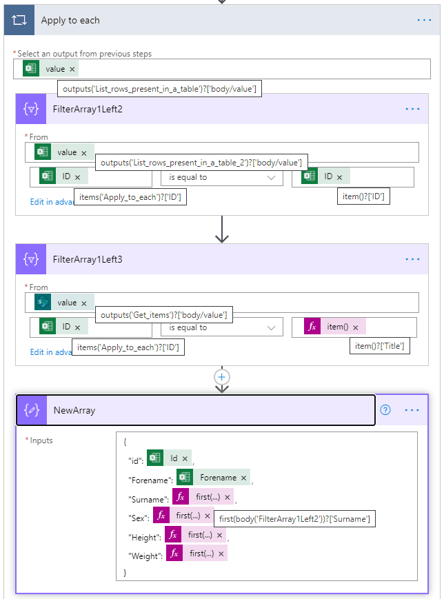 Then we use an apply to each on the main data source dynamic value which is a JSON array of all of the rows retrieved. In this case I have assumed it will by my first List Rows. We then perform a filter (FilterArray1Left2) on the dynamic value from the 2nd list rows and compare the primary key, known as ID from the apply to each with the ID of that of the item being compared. This will identify the row(s) that match, albeit if there is more than one, I will assume the first later on - hence 1 to 1 relationship.