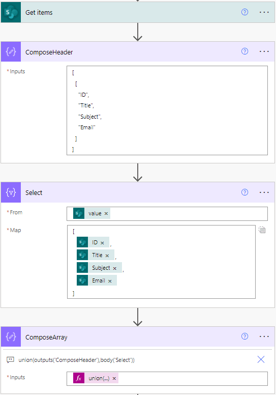 If you were looking for a method to create such an array structure, don’t go jumping on an apply to each loop, try something a bit more efficient like a compose (for the header), a select, and a final compose and a union as follows: