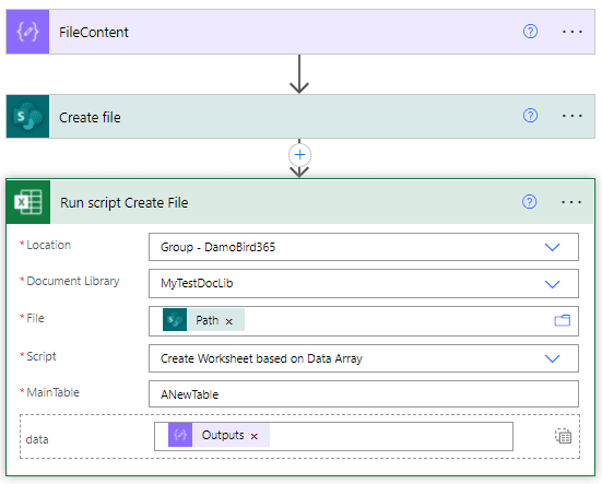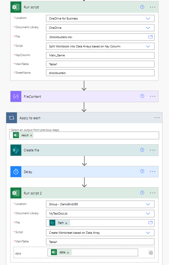 The soltuion to split the workbook into multiple worksheets is all done in one action. Call the first script on the file of your choice and set the key column name, table name and sheet name. If you are looking to perform a split into multiple files, you need to combine the second and third script on an apply to each. I use a compose with the file content of an empty Excel for this and can then create a new file easily. Split the workbook into an array of data sets and then loop through them all to create new files and populate with data using the third script. Note that I inserted a delay of 3 seconds between the create file and run script. Excel can be a bit touchy when it comes to running scripts. Generally scripts will run but if you try to run them in parallel or access the same file continuously, you might get timeouts and retries.